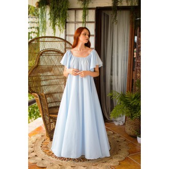 This dress features a light blue hue, creating a fresh and soft feel. Its off-shoulder design reveals a delicate neckline, while the slightly flared sleeves add a playful touch, hinting at a hint of sexiness. The dress cascades naturally from the bust, with a loose, flowing hem that sways gracefully as you walk, embodying a casual and romantic vibe.