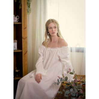 This dress is pure white, with a one-shoulder design that generously reveals the graceful lines of the shoulders and neck, adding a touch of sexiness. The exaggerated, puffy, lantern-shaped sleeves flow naturally from the shoulder, with the cuffs slightly gathered to create a dynamic pleat. The loose, calf-length skirt exudes a relaxed, effortless simplicity that feels like a breeze brushing through it as you walk.