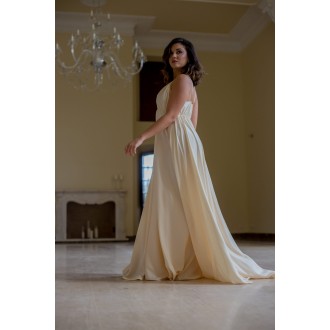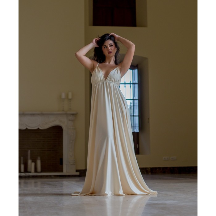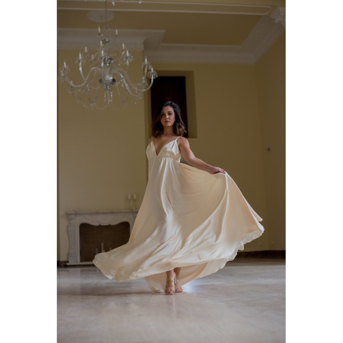 This dress, in a soft cream hue, features a deep V-neck halter design that creates a sexy yet elegant neckline. Delicate pleats gather the bust, creating a loose, full skirt that flows smoothly from the bust. The drape is flawless, flowing like a cloud as you walk, exuding a sense of effortless elegance.