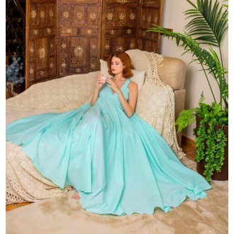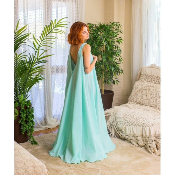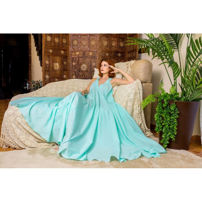 This dress features a refreshing, soft mint green. Its deep V-neck straps create a sensual and elegant neckline, while naturally draped pleats add a layered look. The loose, full skirt cascades smoothly from the bust, creating a beautiful drape. It flows like flowing green waves as you walk, exuding a sense of effortless elegance and sophistication.