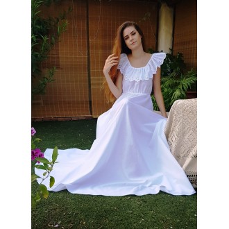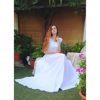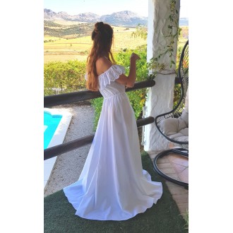 This dress, clad in pure white, features an off-the-shoulder design that reveals a graceful neckline. The delicate lace ruffles at the neckline create a fresh and romantic feel. The short, ruffled sleeves are light and playful, while the cinched waist accentuates the figure. The full skirt drapes naturally and flows smoothly, creating a casual and elegant look as if swept by a breeze.