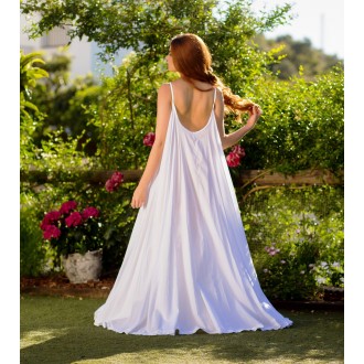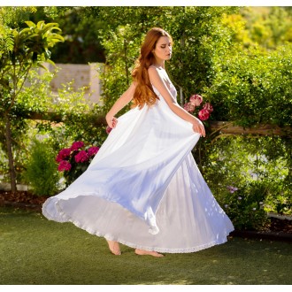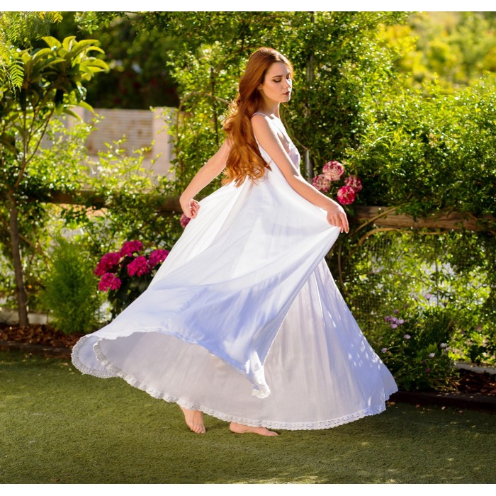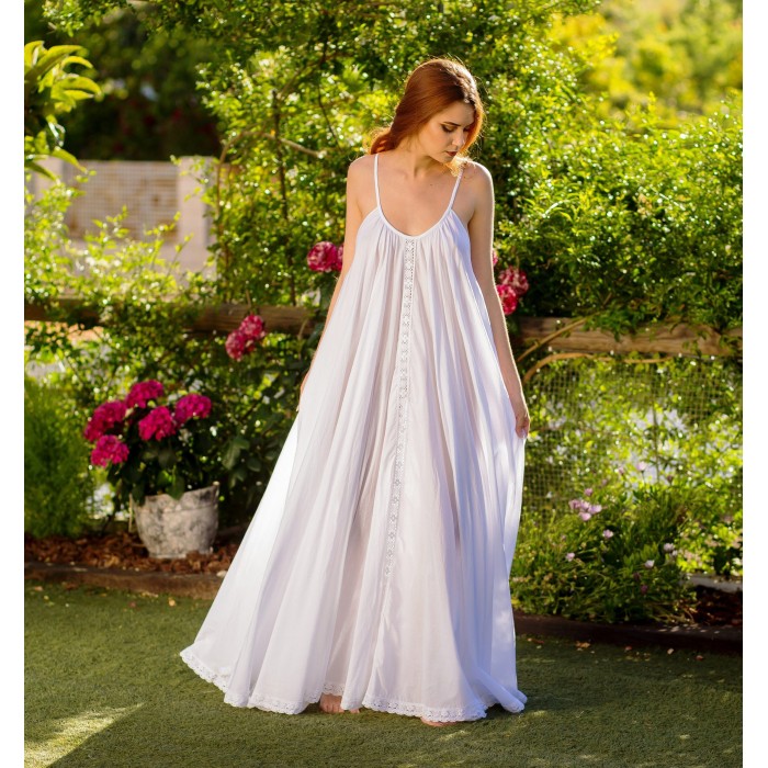 This dress, clad in pure white, features thin straps that accentuate the slender shoulders and neckline, while the plunging V-neckline adds an elegant touch. A row of delicate buttons runs vertically down the center of the dress, echoing the lace trim at the hem. The loose, full skirt drapes naturally, making it feel as light as a cloud as you walk, embodying a romantic and effortless elegance.
