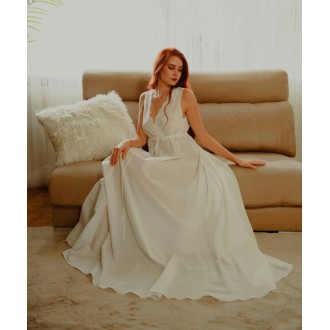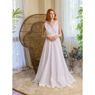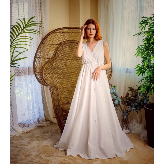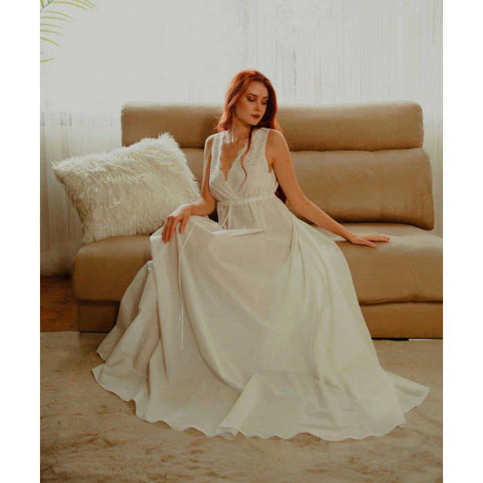 This dress, presented in pure white, features a deep V-neck with delicate lace trims that elegantly define the neckline. The sleeveless silhouette is sleek and elegant, with a cleverly cinched waist that accentuates the slender figure. The full skirt drapes naturally and flows smoothly, creating a gentle breeze as the wearer walks, embodying a gentle and dignified elegance.
